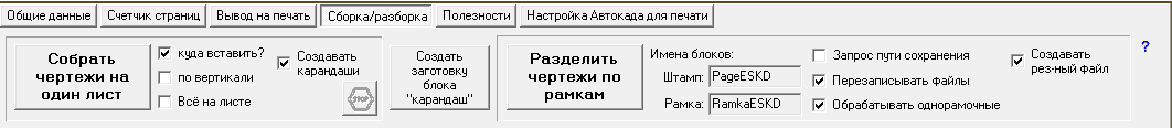 Важный переключатель режима копирования чертежей. Если выключен то выбранные чертежи будут просто расположены по горизонтальной или вертикальной линии. Если включен, то скопированные чертежи располагаются исключительно по горизонтали и разбиваются на группы. Перед каждой группой вставляется блок "Карандаш" с параметрами группы чертежей. |