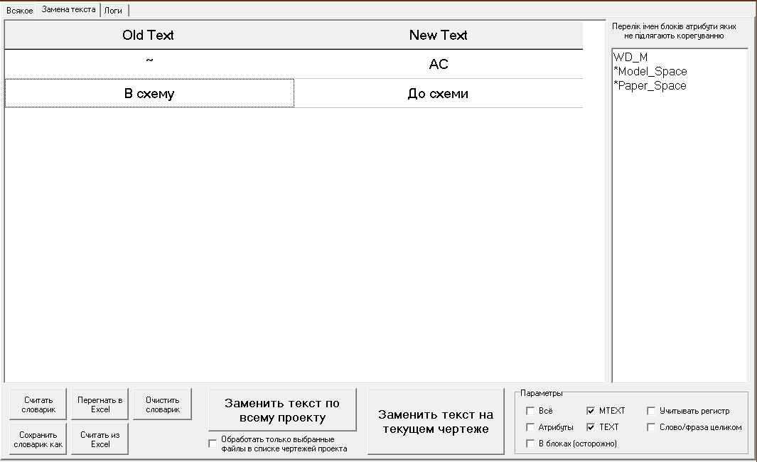 Чтобы игнорировать дополнительные блоки, справа от таблицы словаря предусмотрено текстовое поле, куда можно внести их названия. При обработке чертежа такие блоки будут пропущены.
