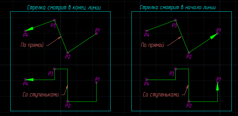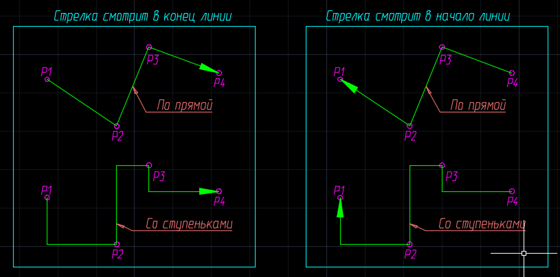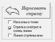 Переключатель "Стрелка смотрит в конец линии" - Если переключатель установлен, то стрелка рисуется в последнем сегменте полилинии, носиком в сторону последней вершины. Если переключатель не установлен, то наоборот, в сторону первой точки.